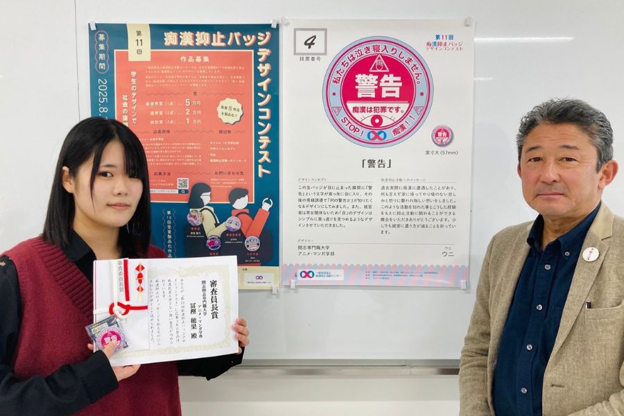 一般社団法人痴漢抑止活動センターが主催する「第11回 痴漢抑止バッジデザインコンテスト」において、本学アニメ・マンガ学部2年の冨樫穂果さん(山形県 致道館高校 出身)が応募し、厳正なる審査の結果、審査員長賞を受賞しました。
