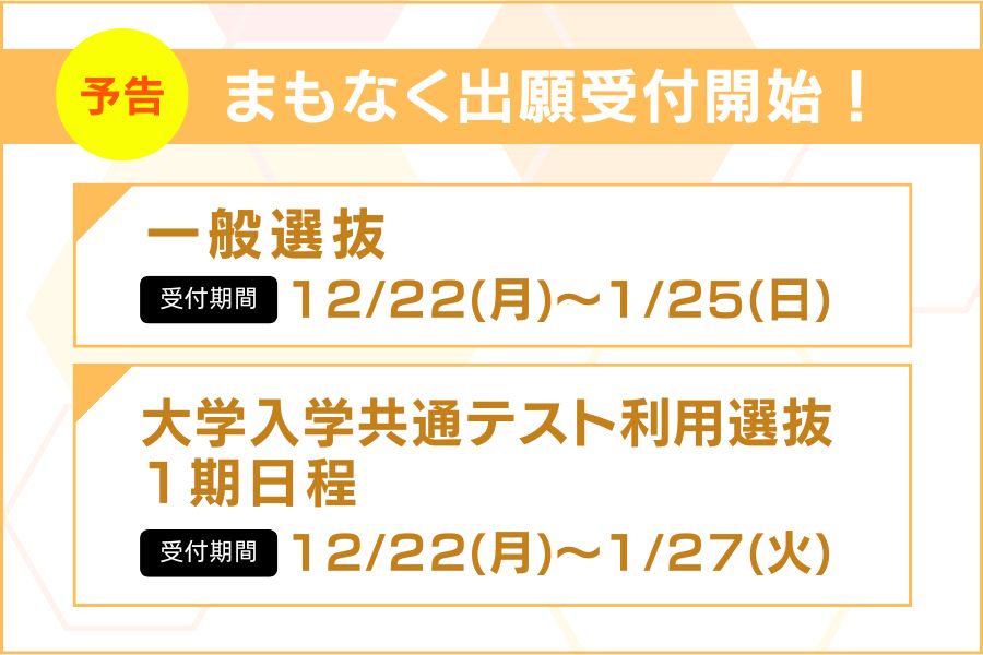12/22(月)より2026年度 「一般選抜」「大学入学共通テスト利用選抜(1期日程)」の出願受付をスタートいたします。