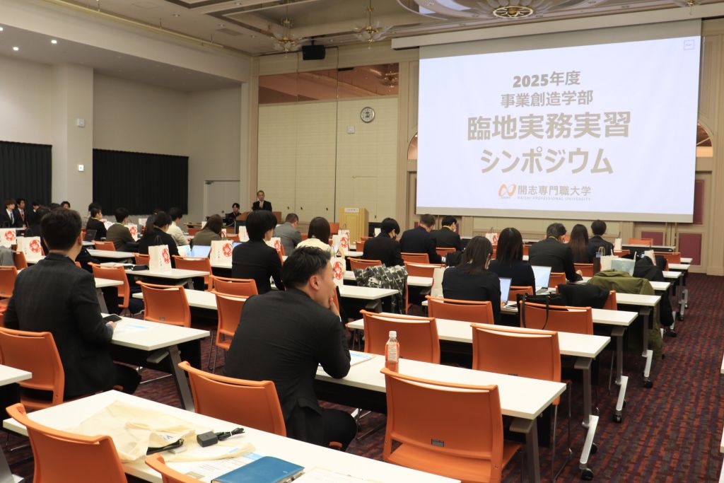 2026年1月14日(水)、事業創造学部にて「臨地実務実習シンポジウム」を開催しました。本シンポジウムは、連携先の企業・団体の皆様とともに、臨地実務実習を通じた学生の学びや成果を共有するとともに、企業間の交流を深めることを目的として実施されました。