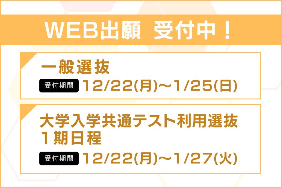12/22(月)より2026年度 「一般選抜」「大学入学共通テスト利用選抜(1期日程)」の出願受付を開始しました。